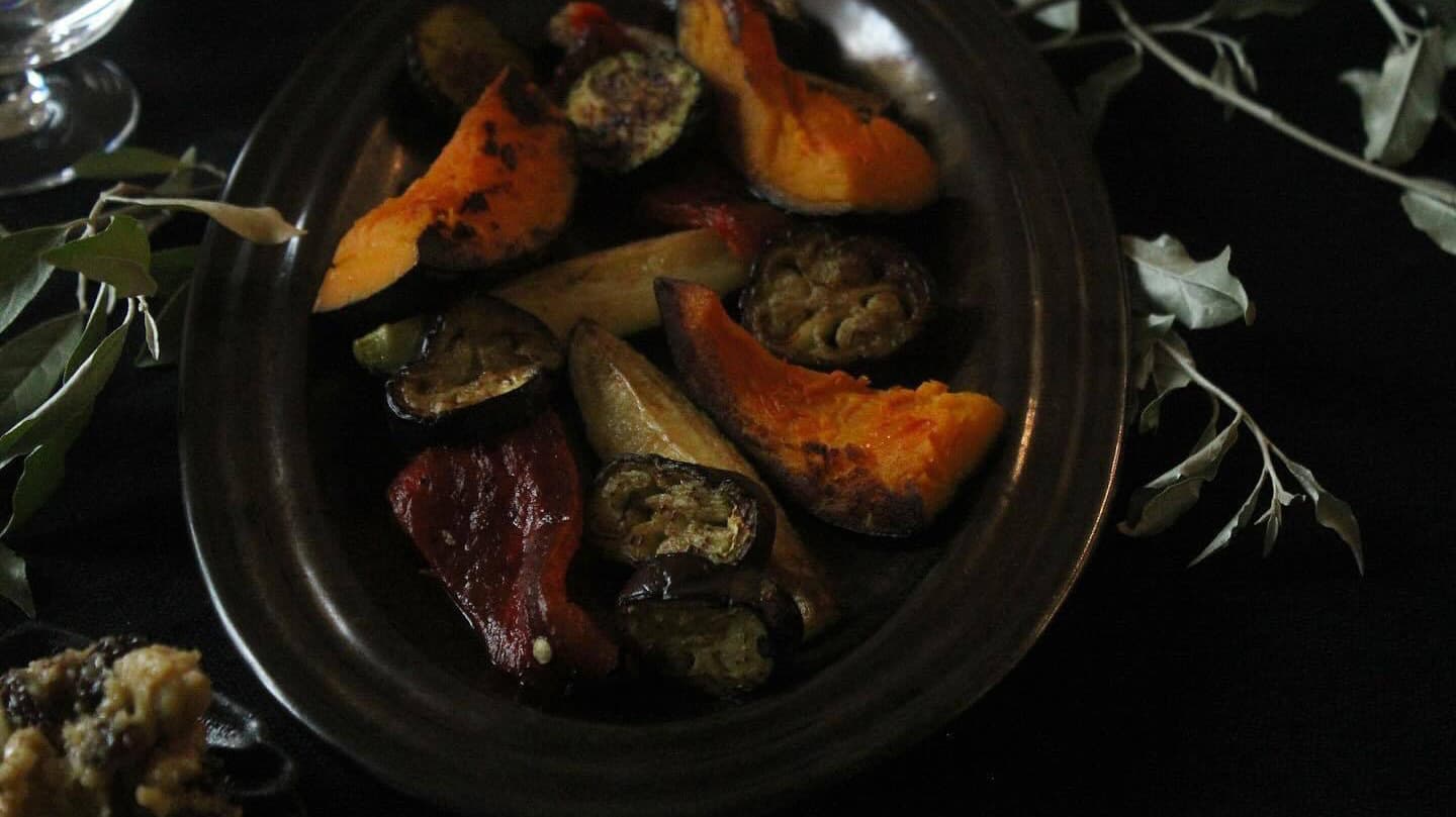 写真は夏野菜のロースト。炙ったり、蒸したり、じっくり焼いたりと火入れを変えて作りました。